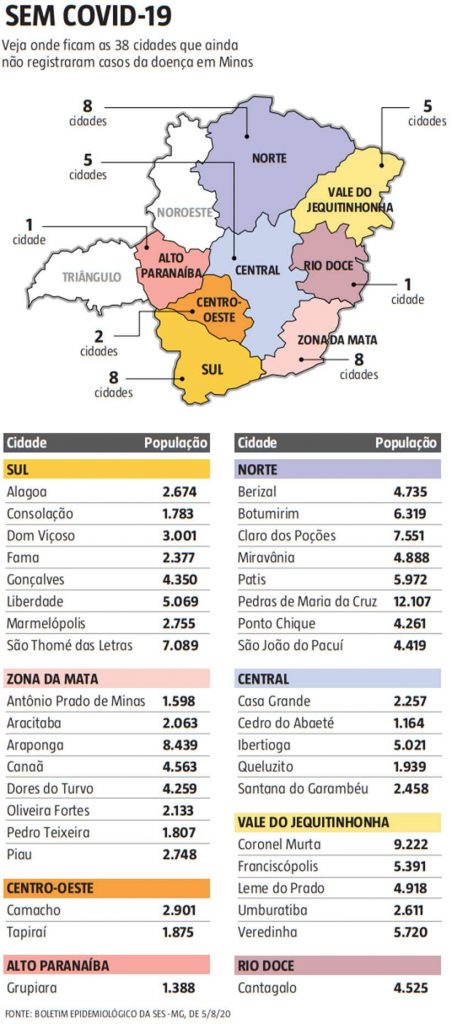 O novo coronavírus já alcançou 95% dos municípios de Minas Gerais. Das 853 cidades que compõem o estado, apenas 38 – o mais populoso deles, Pedra de Maria da Cruz, na Região Norte, tem 12.107 habitantes – escapam da estatística de casos confirmados de COVID-19, segundo dados da Secretaria de Estado de Saúde (SES-MG).