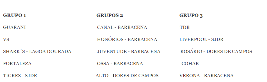 Os dois melhores terceiros colocados de cada grupo, no geral, também avançam para as quartas de final da competição, ou seja, oito equipes seguem na disputa que terá semifinal e final. São apenas cinco times de Barroso, cinco de Barbacena, dois de SJDR, dois de Dores de Campos e um de Lagoa Dourada.