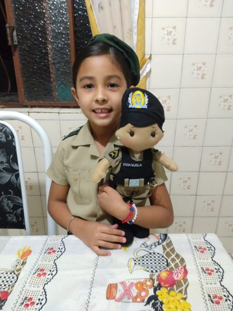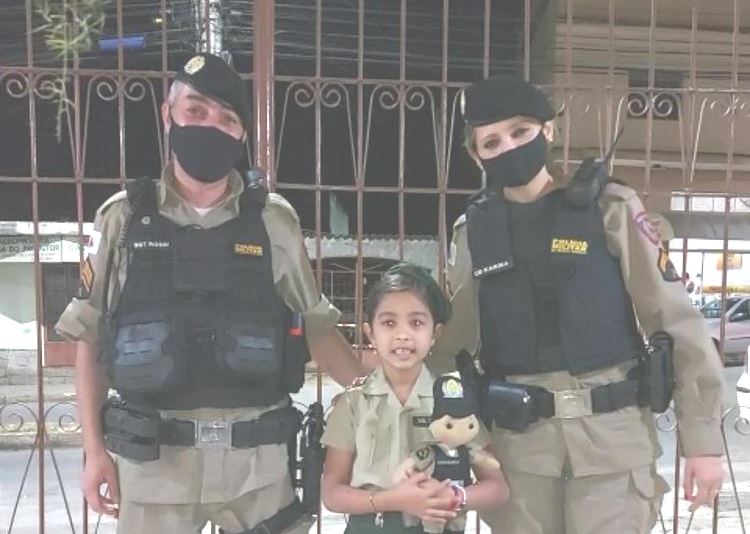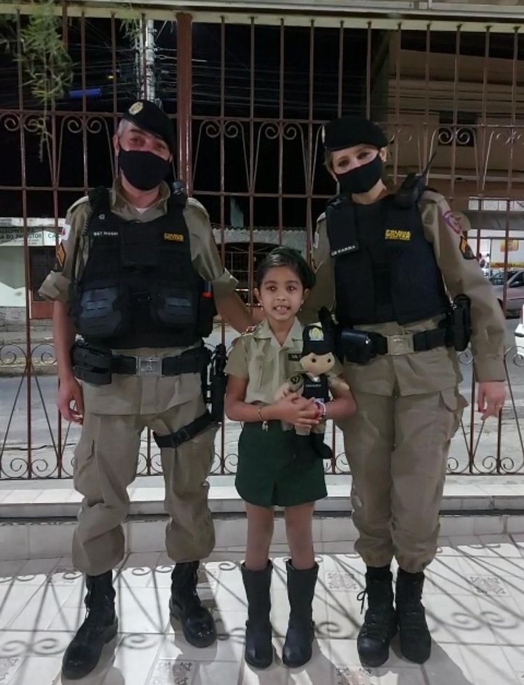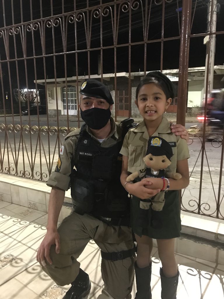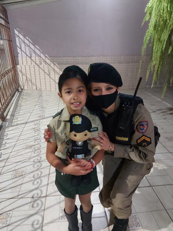 E mais, com todo o protocolo de segurança devido a pandemia de coronavírus, os militares estiveram presentes e ainda levaram uma boneca com direito a nome da aniversariante bordado. “Ela ficou muito feliz ao receber de presente uma boneca personalizada da PM com seu nome”, disse a mãe.