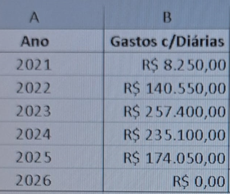 A apuração identificou falhas no controle dessas despesas. Entre os pontos observados estão o pagamento antecipado das diárias e a falta de apresentação de comprovantes claros e detalhados dos gastos realizados durante as viagens.