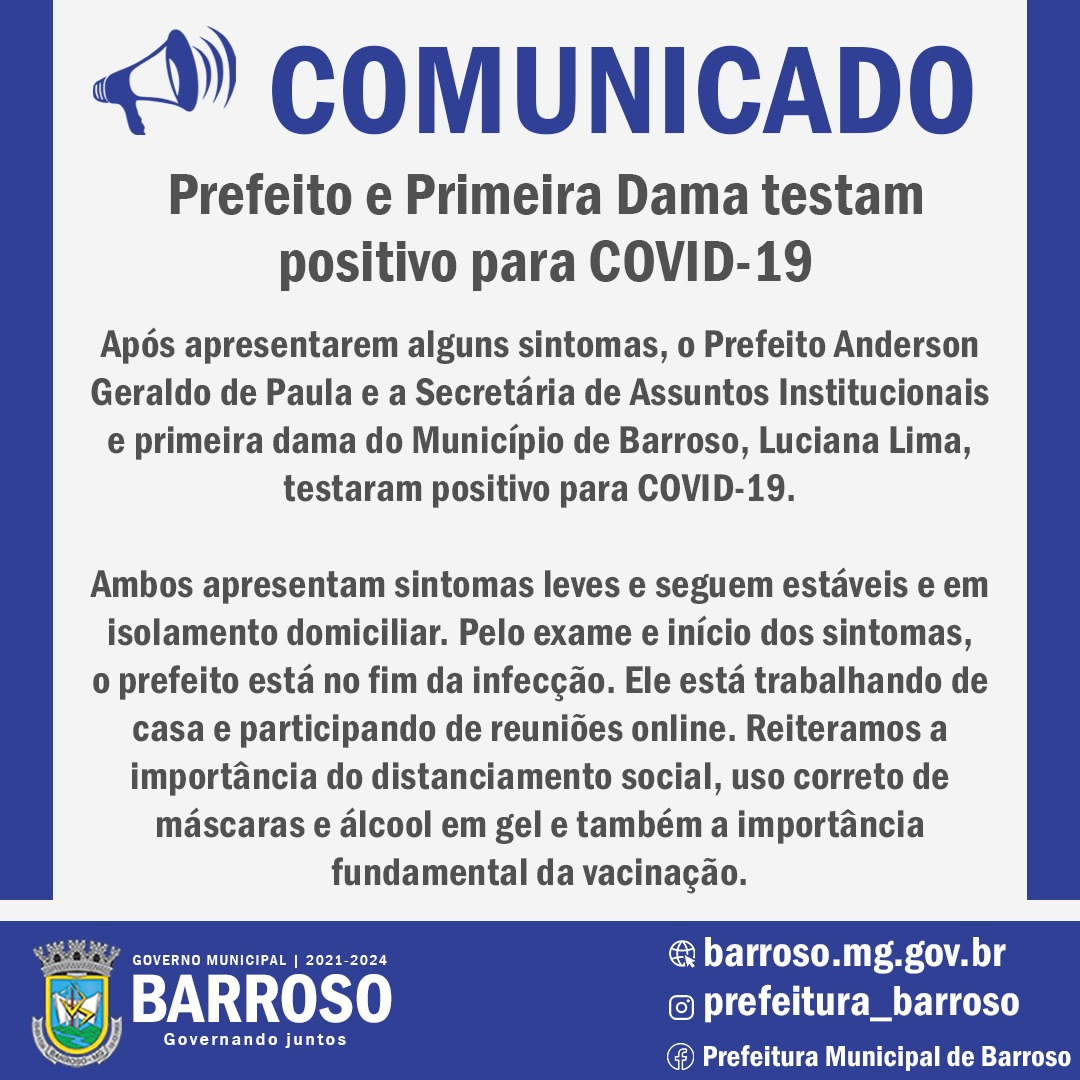 A Prefeitura Municipal de Barroso, através da Assessoria de Imprensa, divulgou nota no início da tarde desta segunda-feira (17), informando que o o Prefeito Anderson de Paula (DEM) testou positivo para Covid-19. A nota também aponta para caso positivo da Primeira Dama e Secretária de Assuntos Institucionais, Luciana Lima.